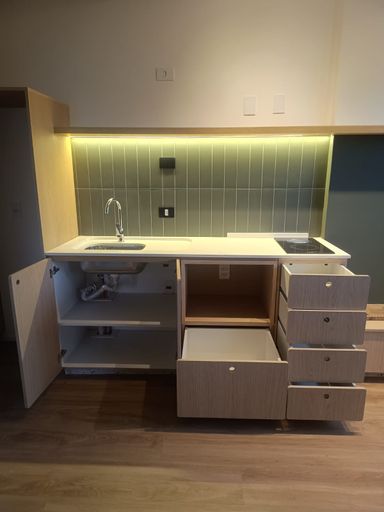 Equipado e Pronto: Marcenaria sob medida premium, cooktop Oster instalado e infraestrutura para ar-condicionado.