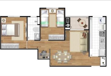 Apartamento com 50 mts² com dois dormitórios sendo um escritório com armários, sala de estar e jantar com sacada, cozinha com armários e fogão, área de serviço, banheiro e uma vaga de garagem.